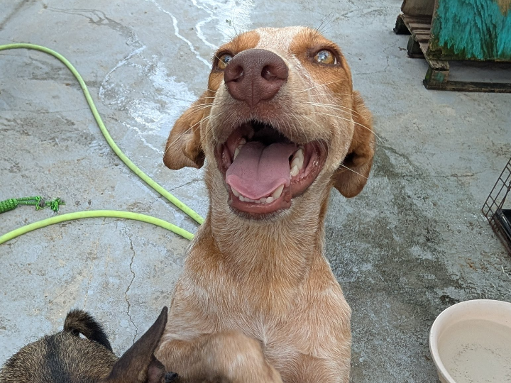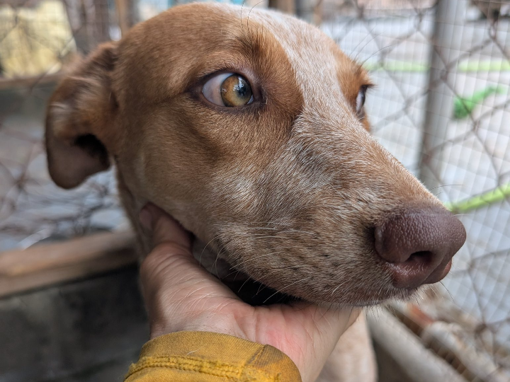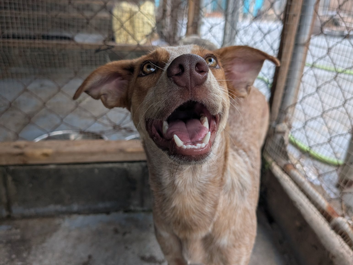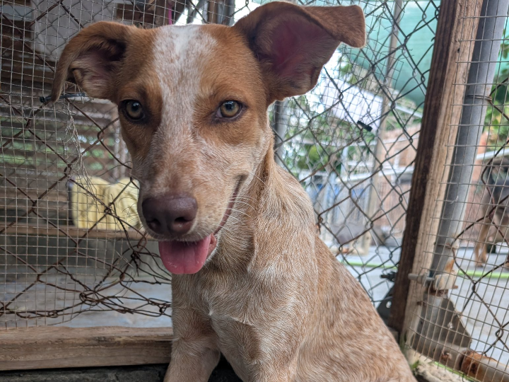 Foster insights/story: Frisbee arrived as a puppy at our sanctuary. He gets along well with other dogs and people. He can be a bit shy at first as he is used to all the pups getting attention at once (he is in a busy pen). When he gets attention, he is sociable and cheerful. He would do well in a family and would likely learn quickly the comfort of a home!