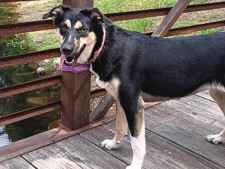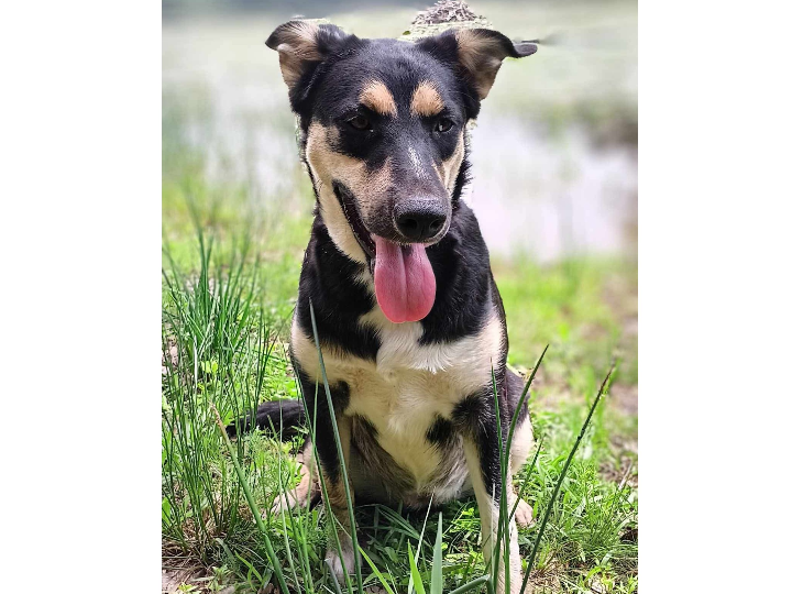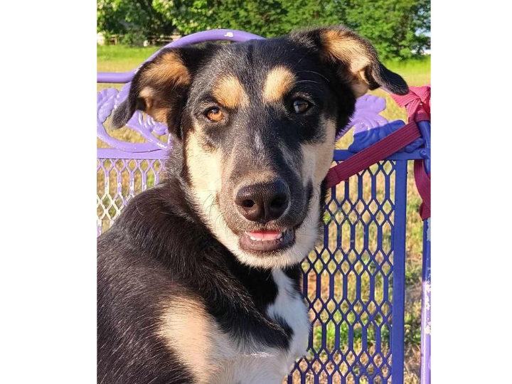 Now just 1 year old and 54 lbs, Sunni is a gorgeous Siberian Husky / Mini Australian Shepherd mix with a stunning tri-colored coat and warm brown eyes, accented by the cutest little blue spot in her left eye — her signature sparkle